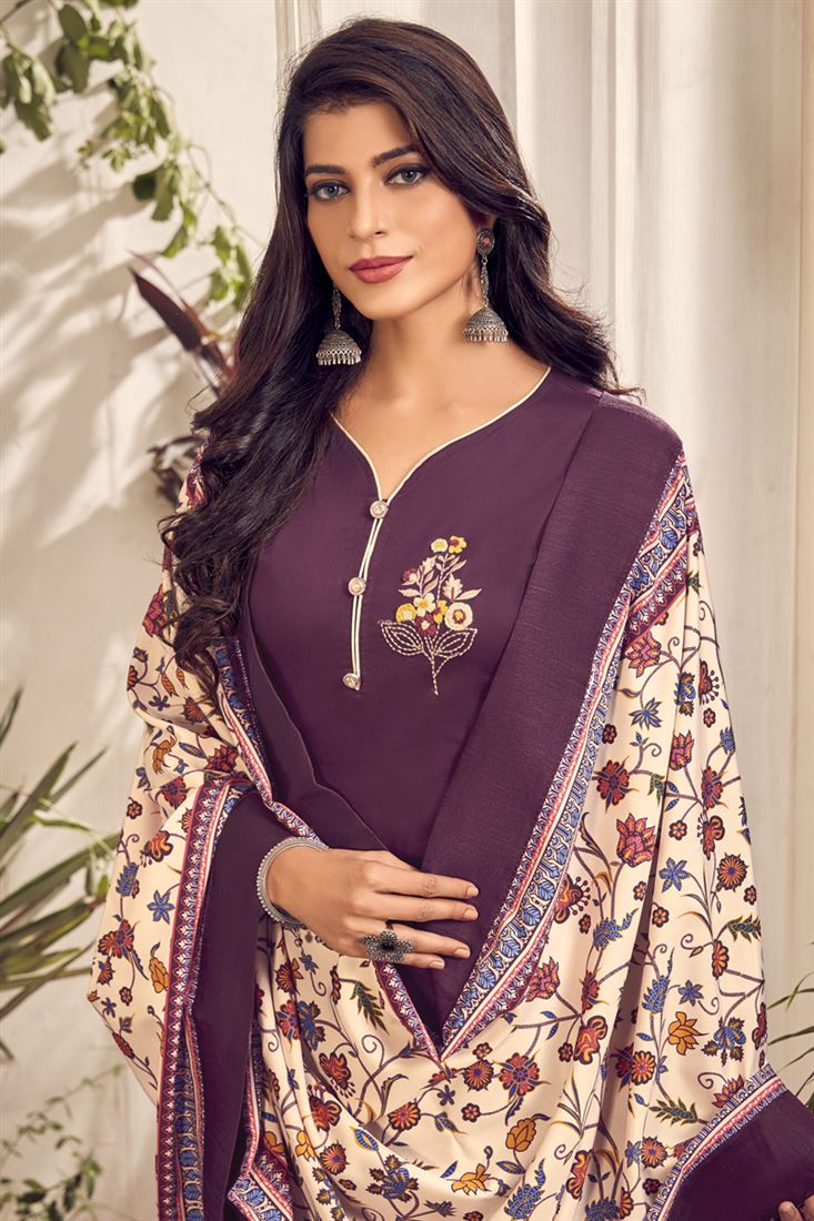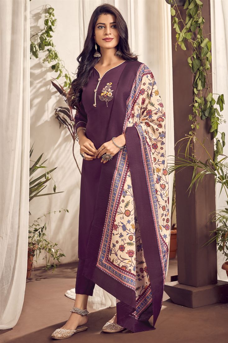 Attractive Purple Color Cotton Fabric Readymade Straight Cut Salwar Suit With Printed Dupatta