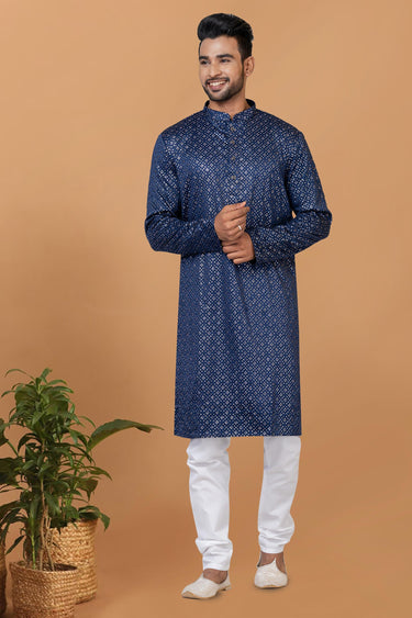 Attractive Sequins Embroidery Readymade Kurta Pyjama For Men In Blue Color Gajji Silk Fabric