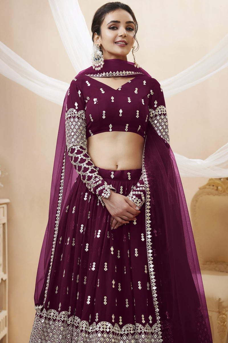 Awesome Embroidered Work On Georgette Fabric Wine Color Lehenga Choli