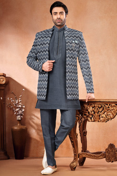 Banarasi Silk Beautiful Embroidery Work Grey Color Wedding Wear Readymade Indo Western Jodhpuri Suit For Men