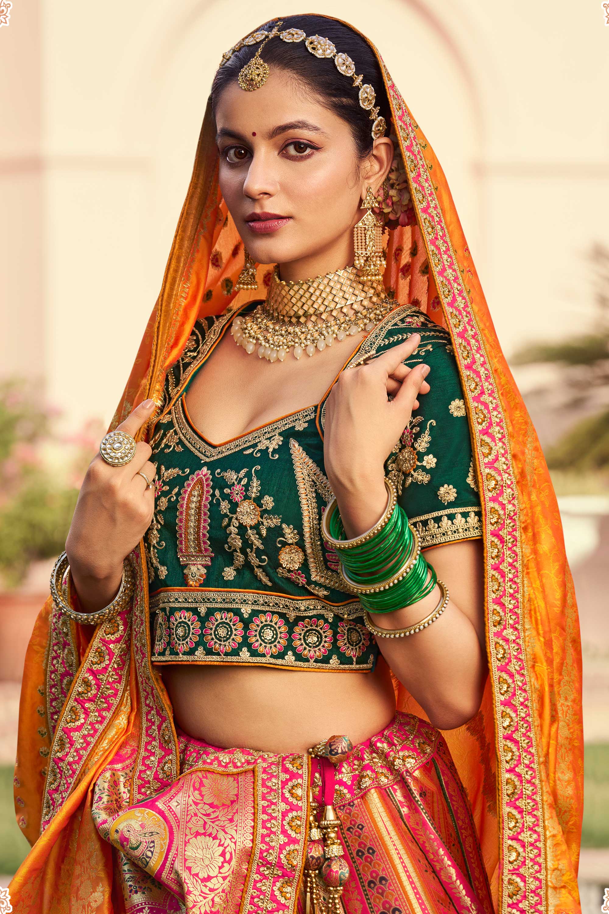 Embrace royal sophistication with the Reach Color Designer Bridal Lehenga Choli, tailored with premium Banarasi silk and adorned with ornate embroidery. This outfit is perfect for brides seeking a timeless and refined appearance, offering both charm and comfort. The carefully designed patterns bring together traditional elegance and contemporary aesthetics, ensuring you shine effortlessly at your wedding events. Make your special moments unforgettable with this bridal masterpiece.