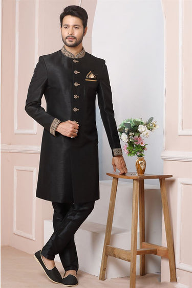 Beautiful Black Color Banarasi Silk Fabric Wedding Wear Indo Western For Men