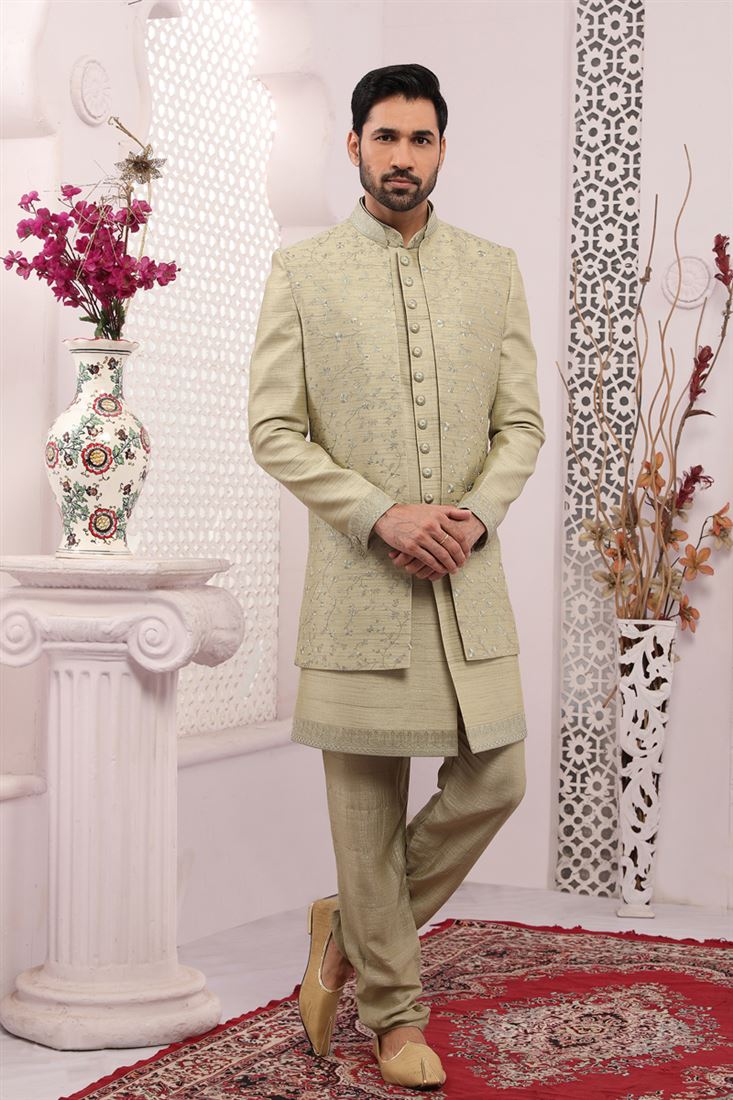 Beautiful Cream Color Banarasi Silk Fabric Embroidered Work Wedding Function Readymade Trendy Indo Western For Men