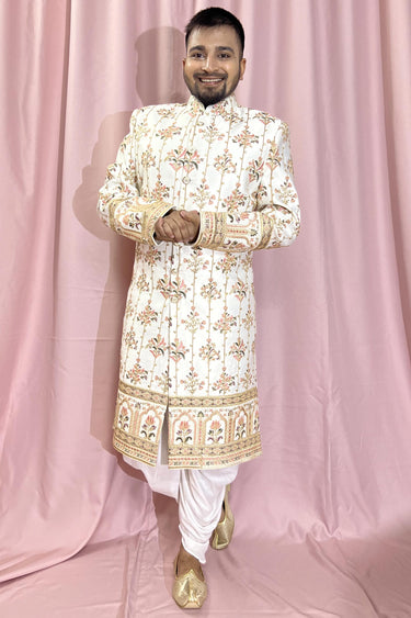 Beautiful Cream Color Wedding Wear Readymade Sherwani For Men In Silk Fabric