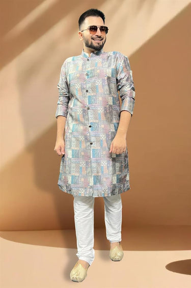 Beautiful Grey Color Wedding Wear Readymade Kurta Pyjama For Men In Silk Fabric