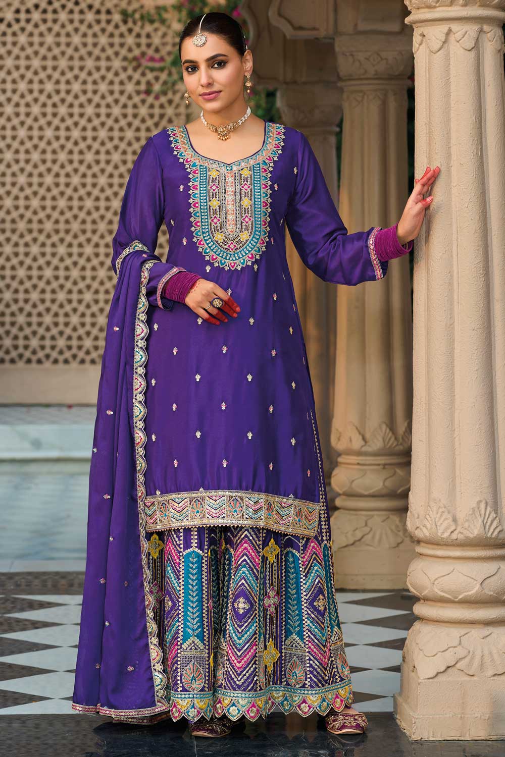 Beautiful Purple Color Readymade Palazzo Suit In Chinon Fabric