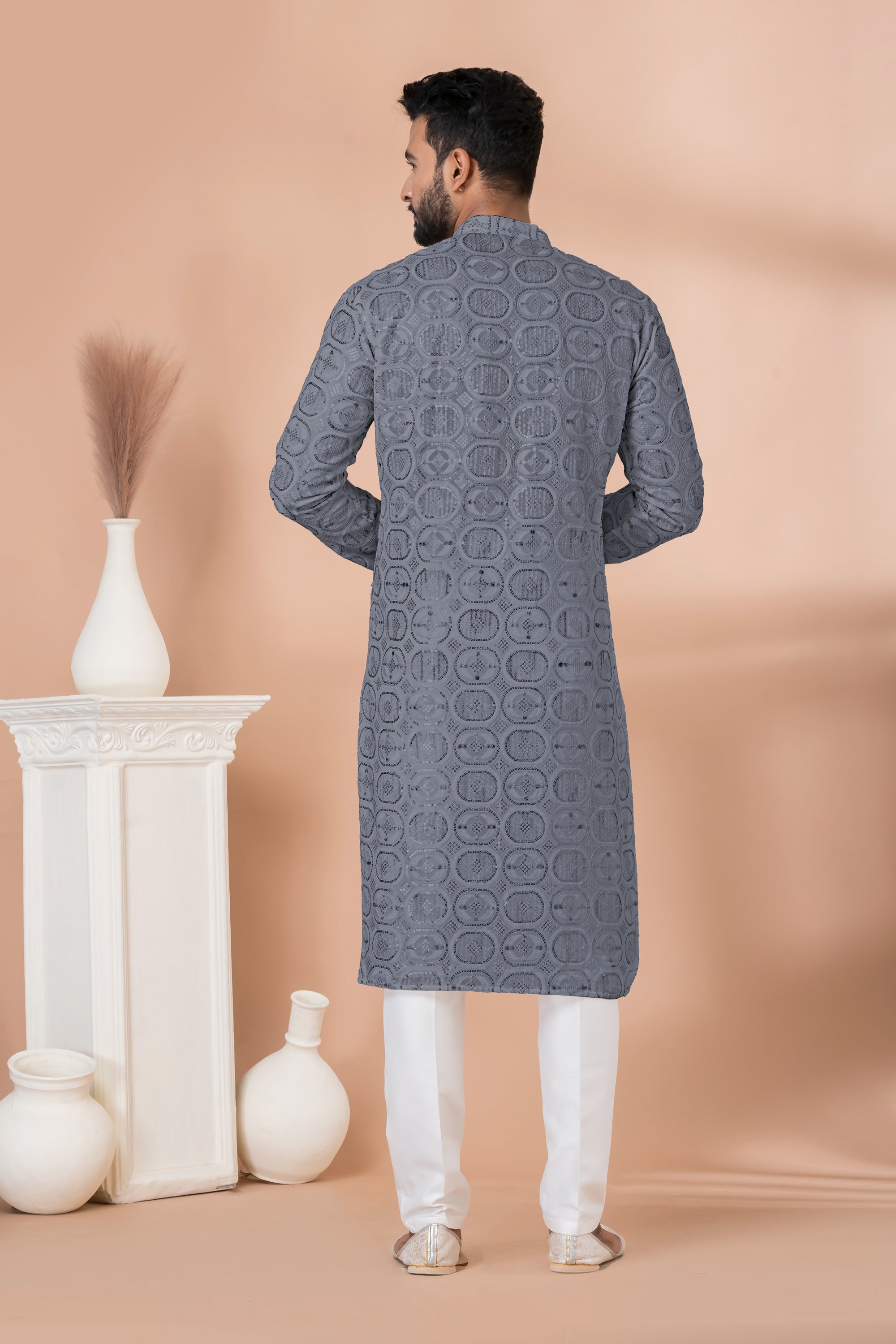 Beautiful Sequins Embroidery Georgette Fabric Wedding Wear Readymade Kurta Pyjama For Men In Grey Color