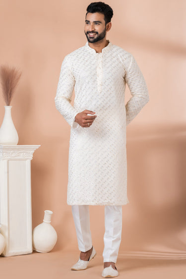 Beautiful Sequins Embroidery White Color Wedding Wear Readymade Kurta Pyjama For Men In Georgette Fabric
