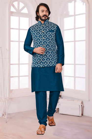 Beautiful Teal Color Art Silk Fabric Festive Wear Readymade Kurta Pyjama With Trendy Jacket
