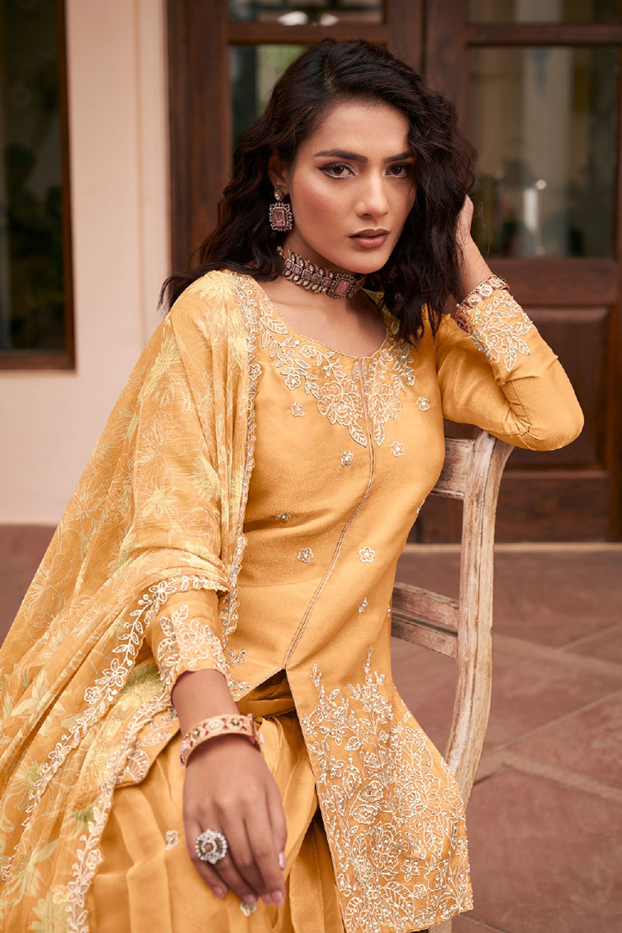 Step into elegance with this stunning Readymade Palazzo Suit, perfect for special functions and festive occasions. The top is crafted from heavy premium MOS silk and beautifully enhanced with intricate heavy embroidery work, giving it a rich and graceful appeal. It is paired with a comfortable heavy premium silk palazzo bottom that adds a stylish flow to the outfit. Completing the look is a heavy premium Bemberg chiffon dupatta featuring elegant digital prints and detailed embroidery work, adding charm and sophistication to the ensemble. Note: Due to digital photography, slight color variations may occur.