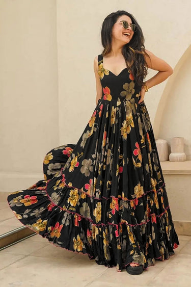 Beguiling Digital Printed Black Color Rayon Fabric Readymade Gown