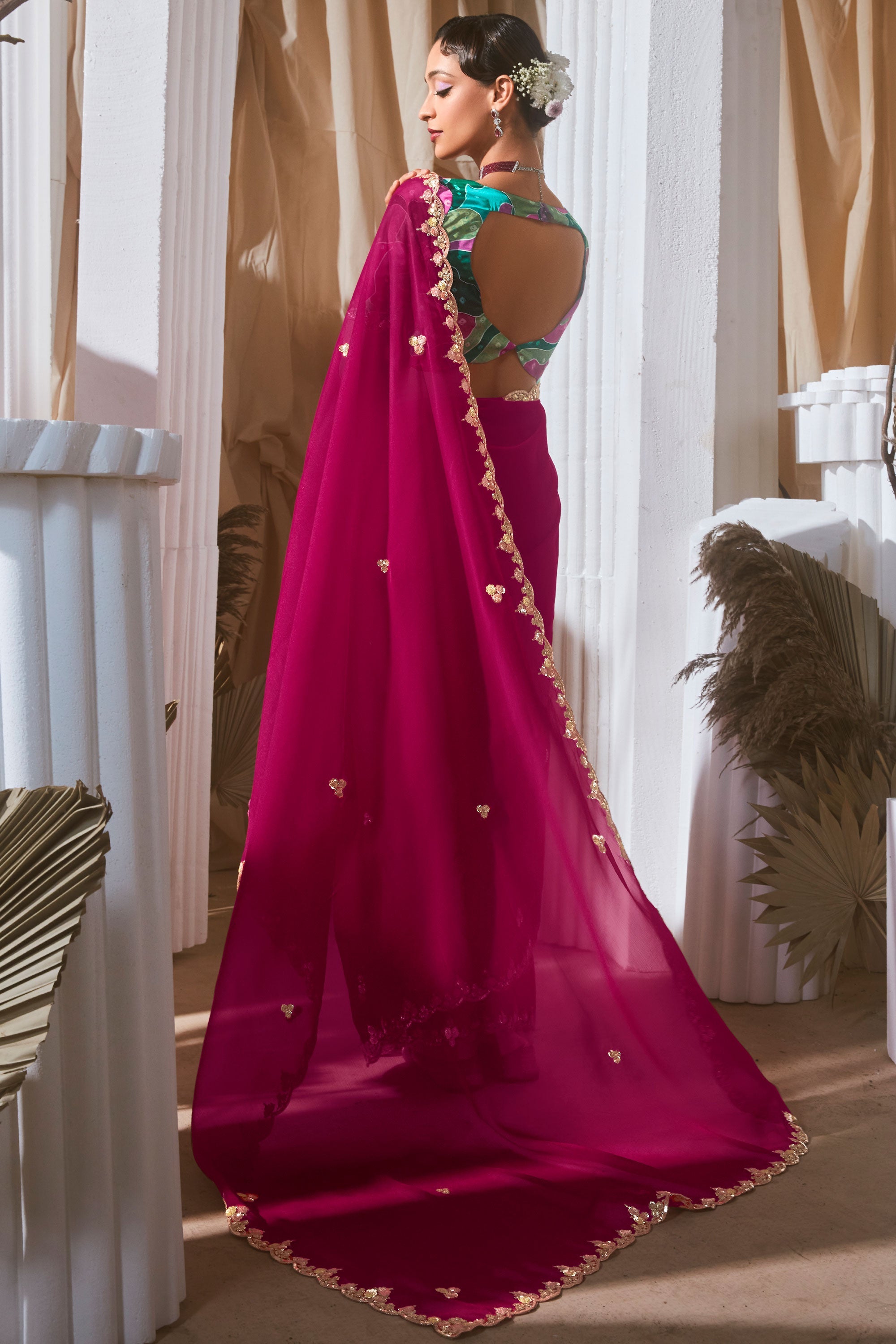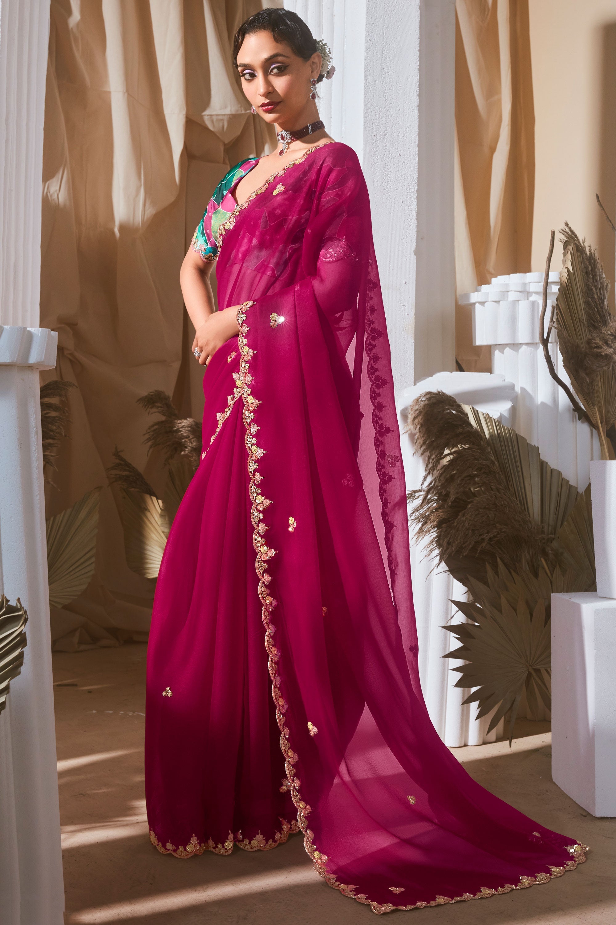 Beguiling Sequins Work On Magenta Color Fancy Fabric Saree