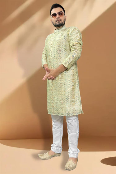 Beige Color Sangeet Wear Pretty Kurta Pyjama For Men In Silk Fabric