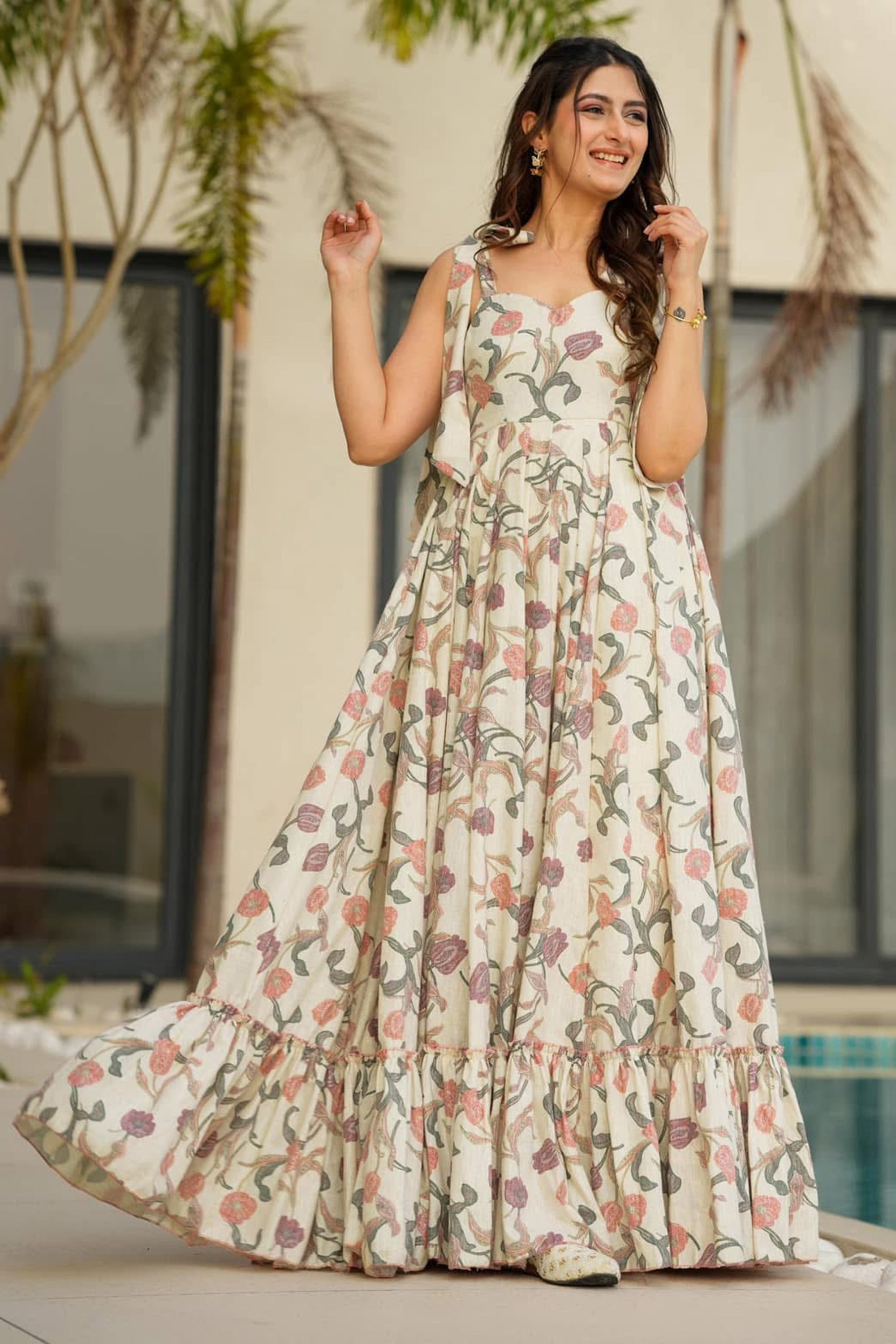 Beige Digital Printed Floor Touch Readymade Anarkali Style Gown