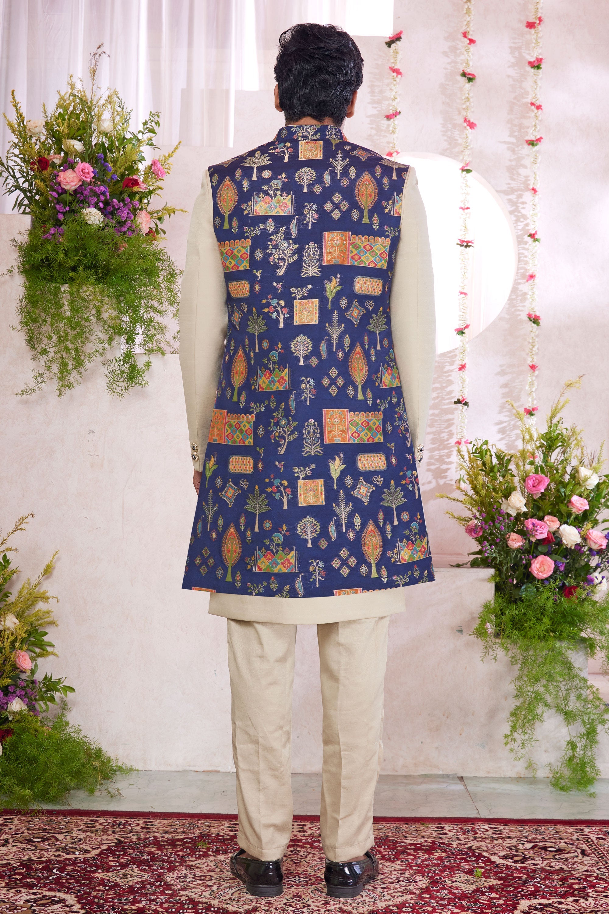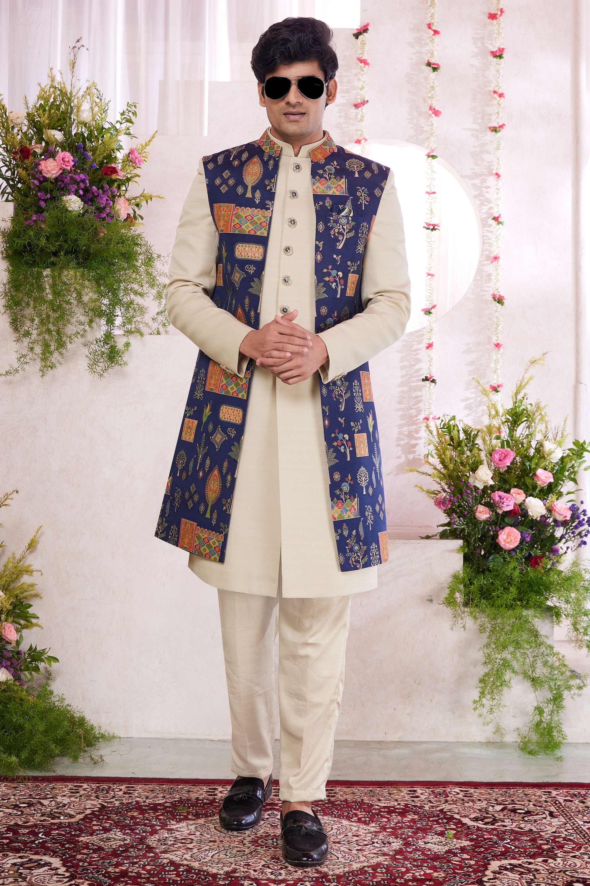 Beige Jacquard Art Silk Wedding Wear Readymade Indo Western For Men