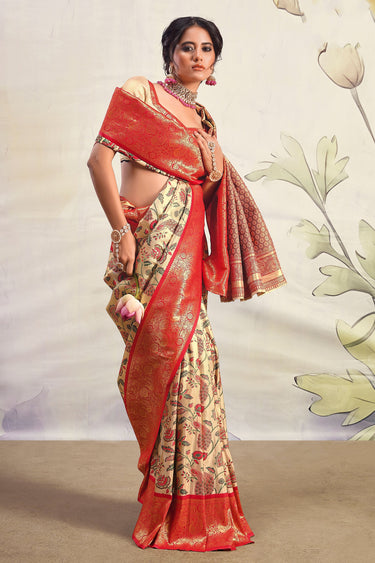 Enhance your festive look with this stunning Festive Wear Elegance Printed Saree in Beige Color. Crafted from pure Dharmavaram silk, this saree promises a luxurious feel and an exquisite appearance. The un-stitched blouse, made from the same fine silk, offers you the flexibility to tailor it to your own style and fit. Ideal for bridal collections, this saree adds an elegant touch to your special day. Please note, there may be slight color variations due to digital photography.