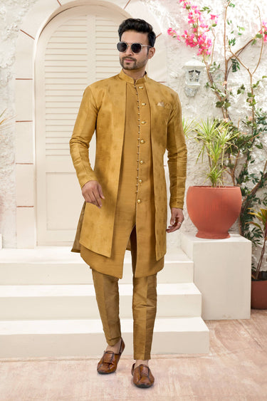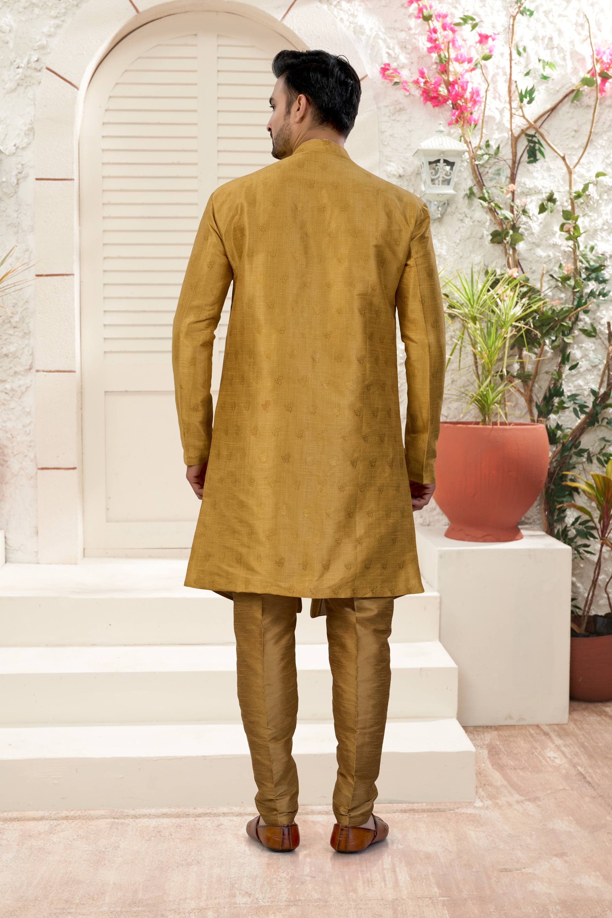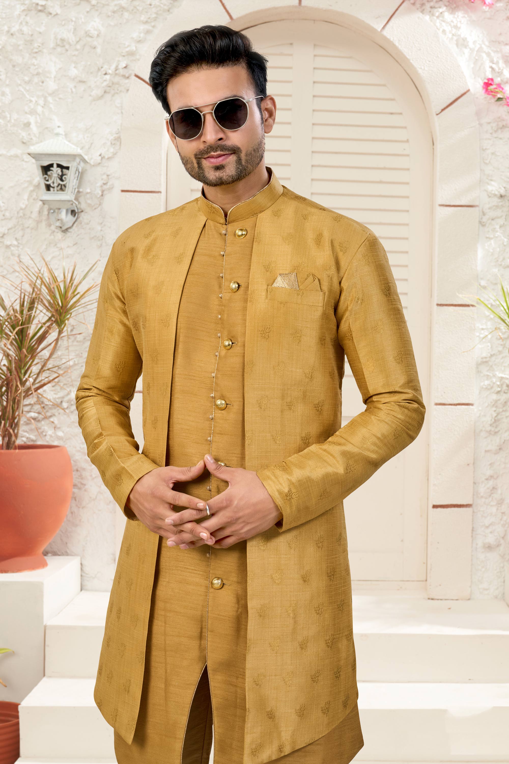 Beige Wedding Wear Jacquard Silk Fabric Readymade Indo Western For Men