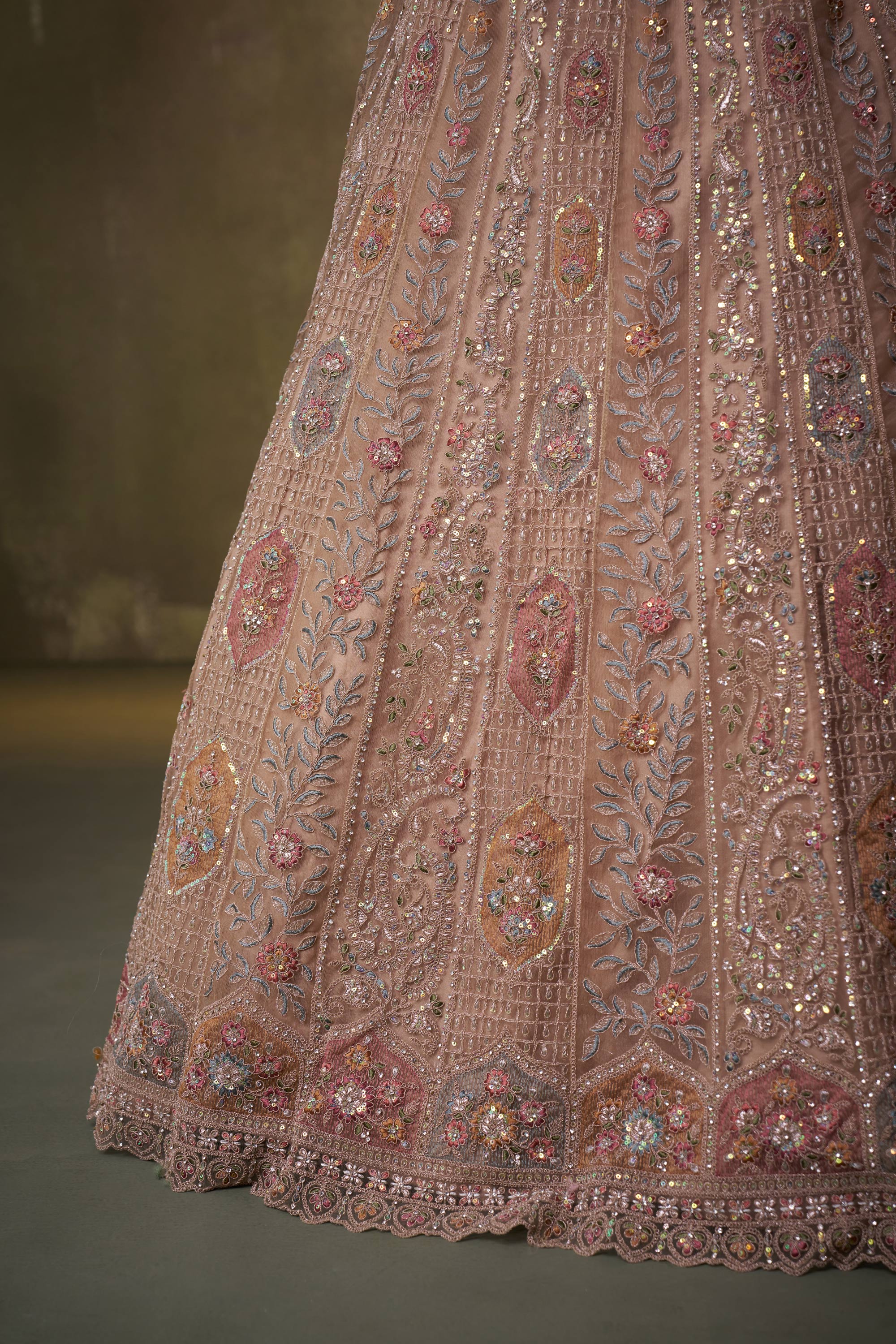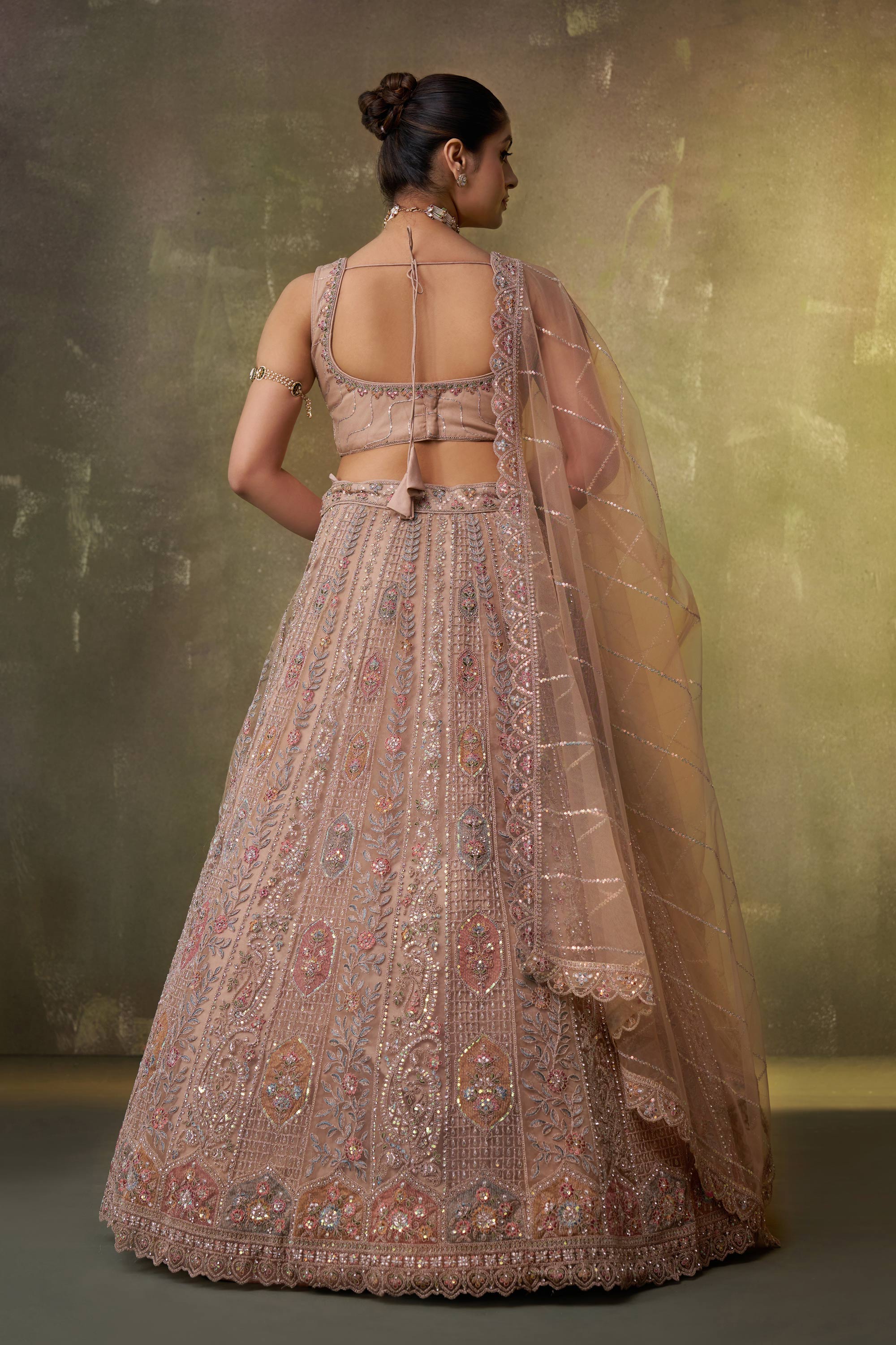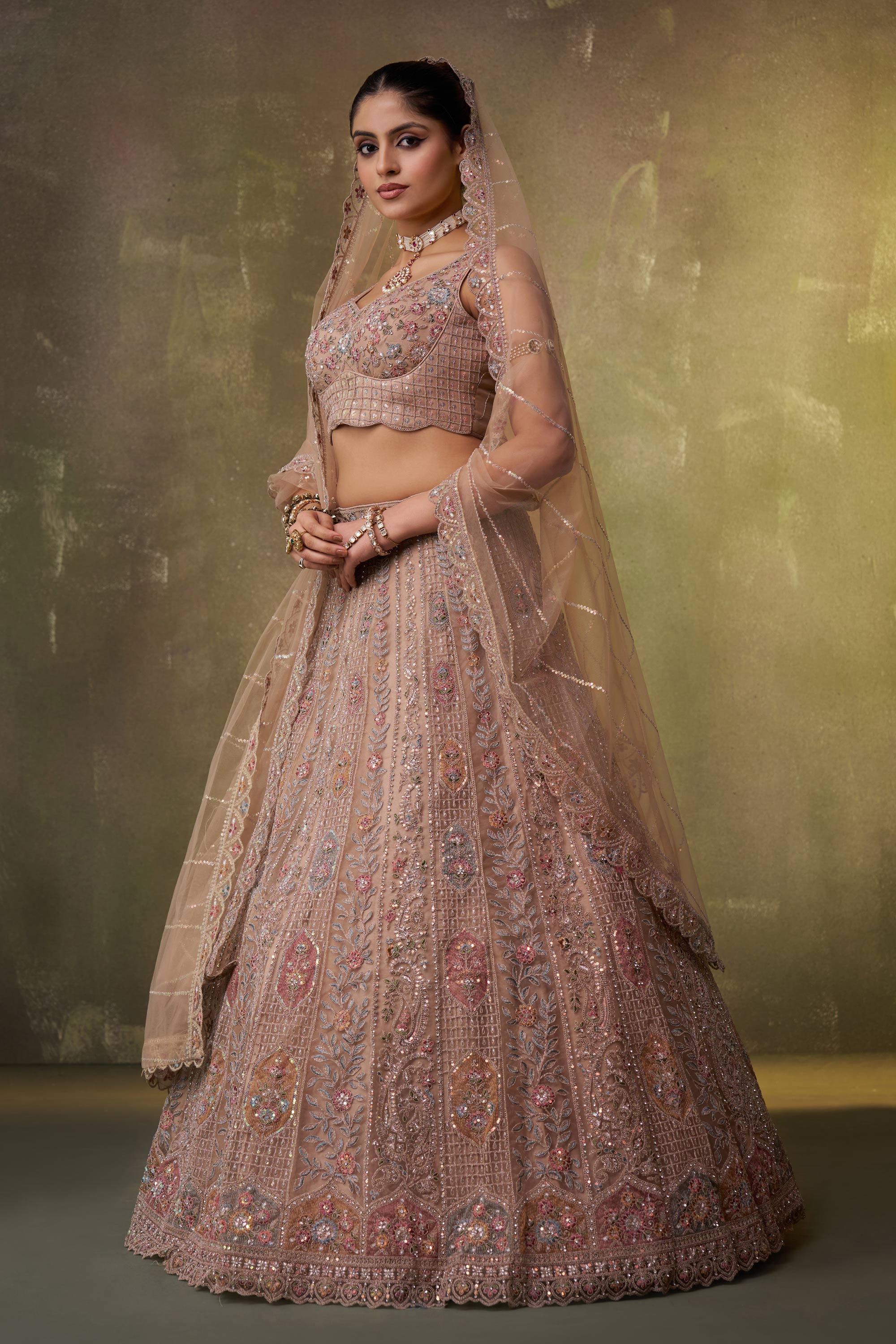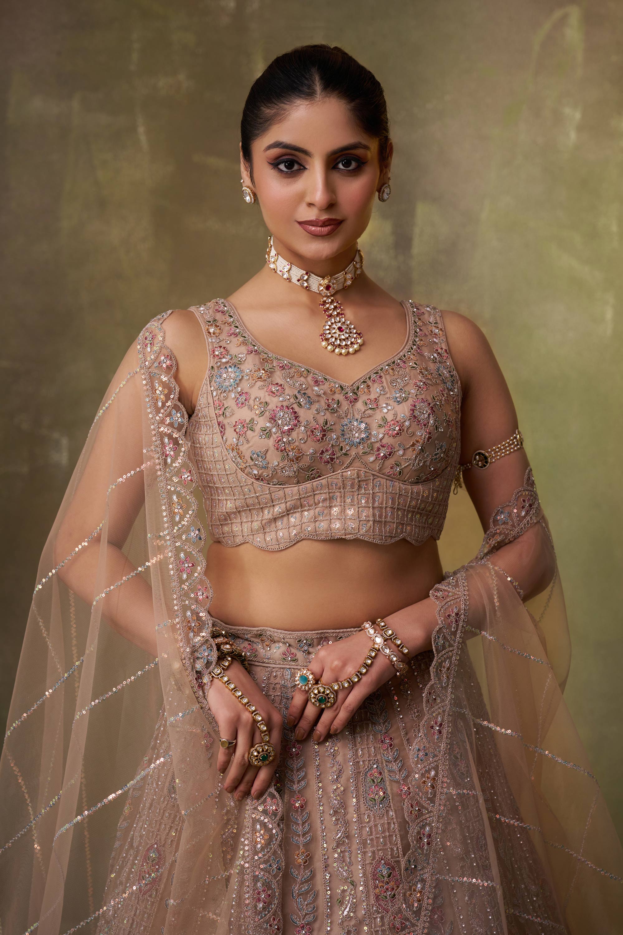 Beige Wedding Wear Net Embroidered Lehenga Choli