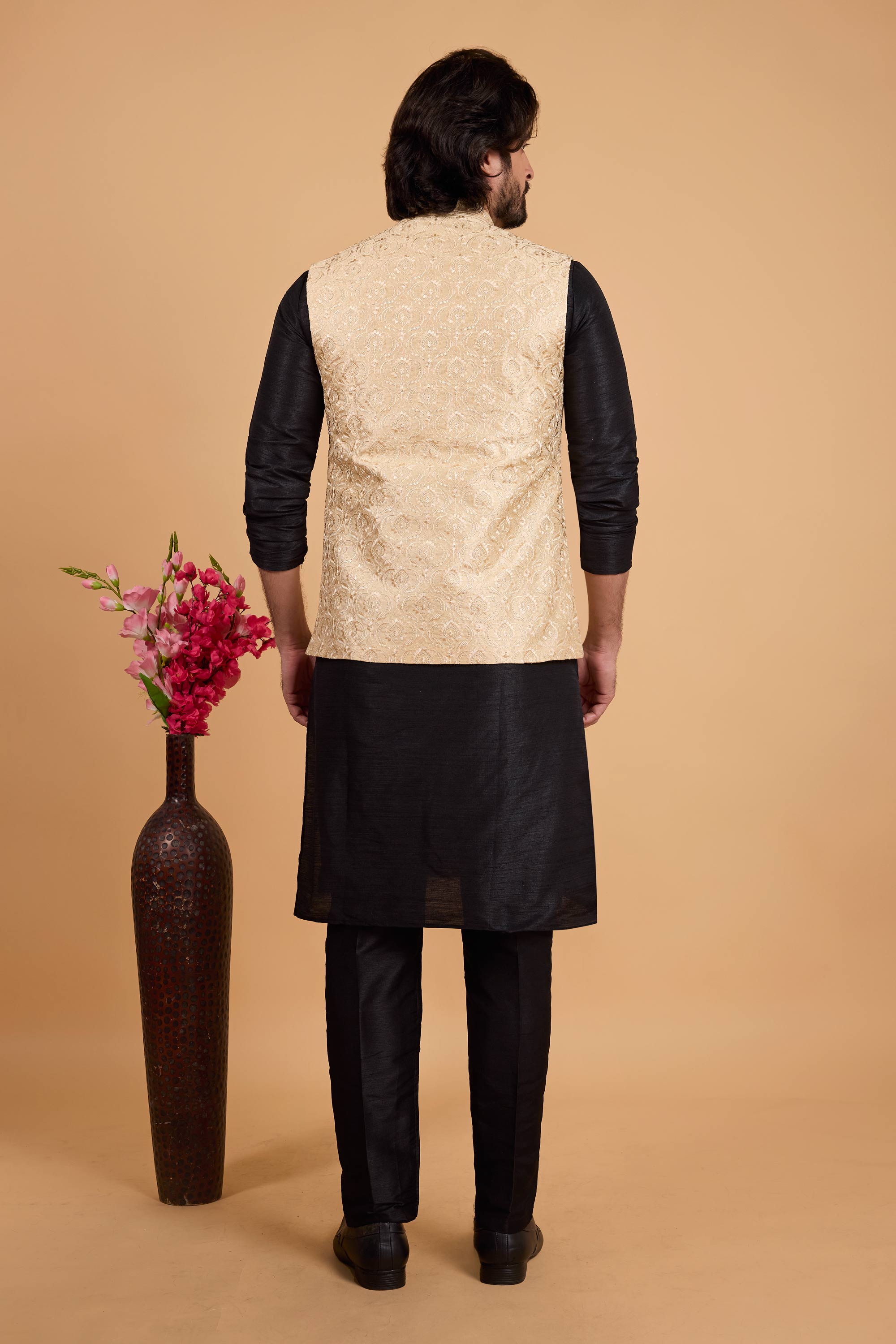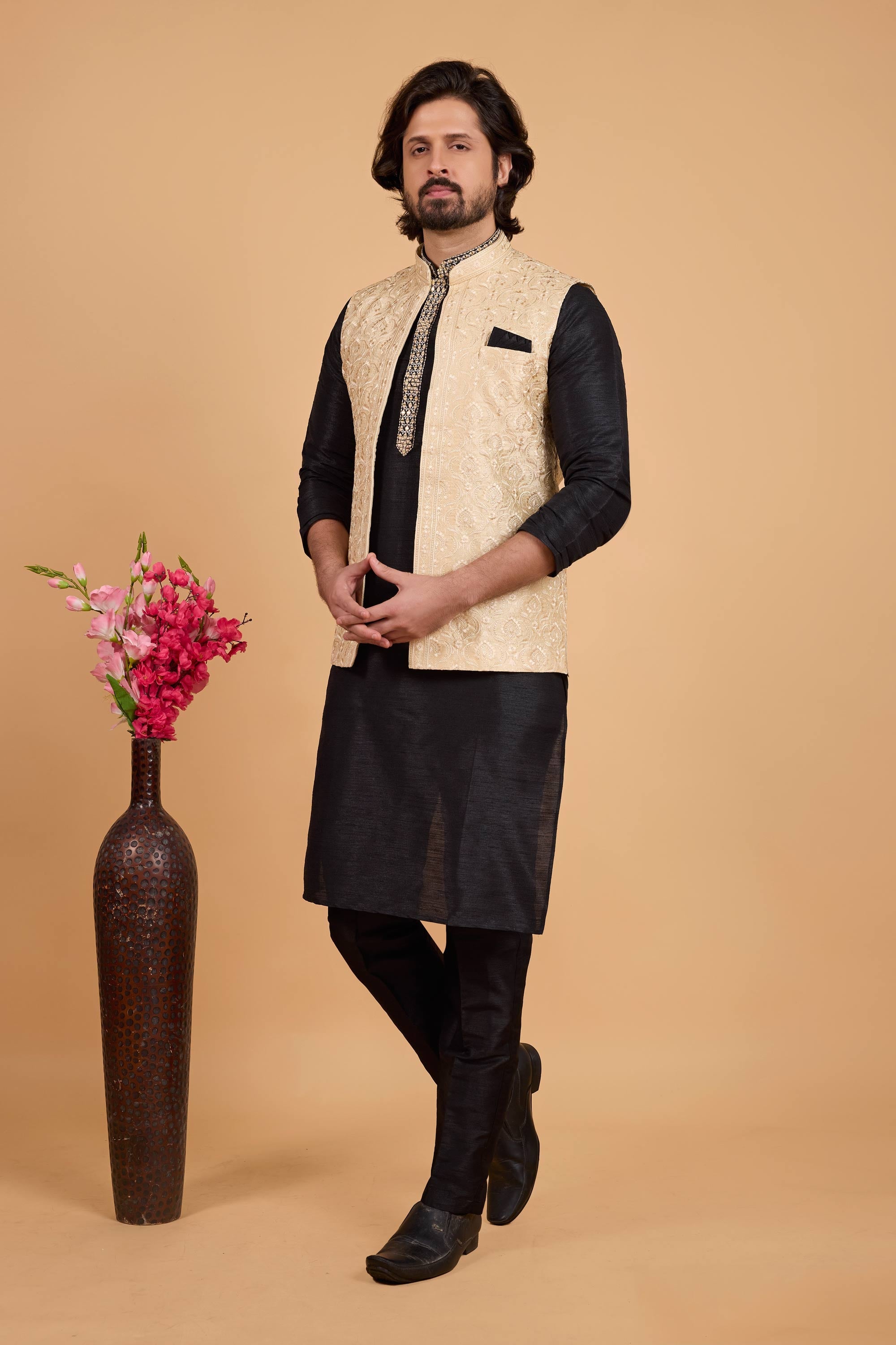 Black Art Silk Wedding Wear Readymade Kurta And Aligadhi Pant For Men