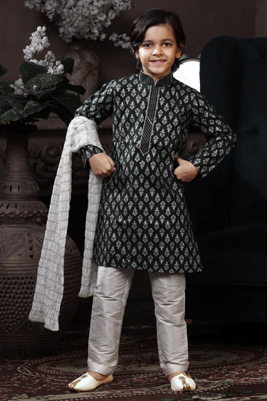 Black Color Cotton Fabric Printed Wedding Wear Readymade Boys Kurta Pyjama