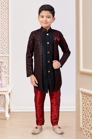 Introduce your young gentleman to classic style with the Reach Color Traditional Wear Boys Readymade Indo Western. Perfect for special occasions, this ensemble offers a delightful mix of tradition and contemporary fashion. It includes a kurta adorned with exquisite embroidery and matching bottoms, designed to provide both flair and comfort. The fabric is soft on the skin and allows for unrestricted movement, making it an ideal choice for active boys. With a variety of sizes available, this outfit is perfect for boys who enjoy looking their best at family events, cultural celebrations, and other festivities. Enhance your boy's wardrobe with this stylish piece today.