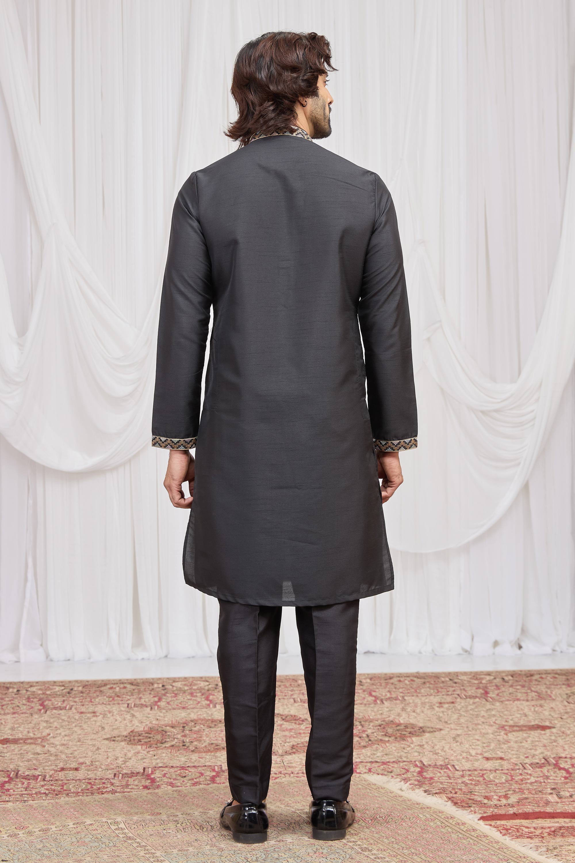 Black Festive Wear Art Silk Fabric Readymade Kurta Pyjama With Stole For Men