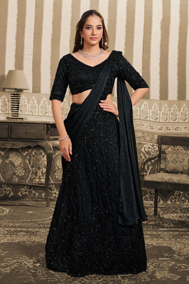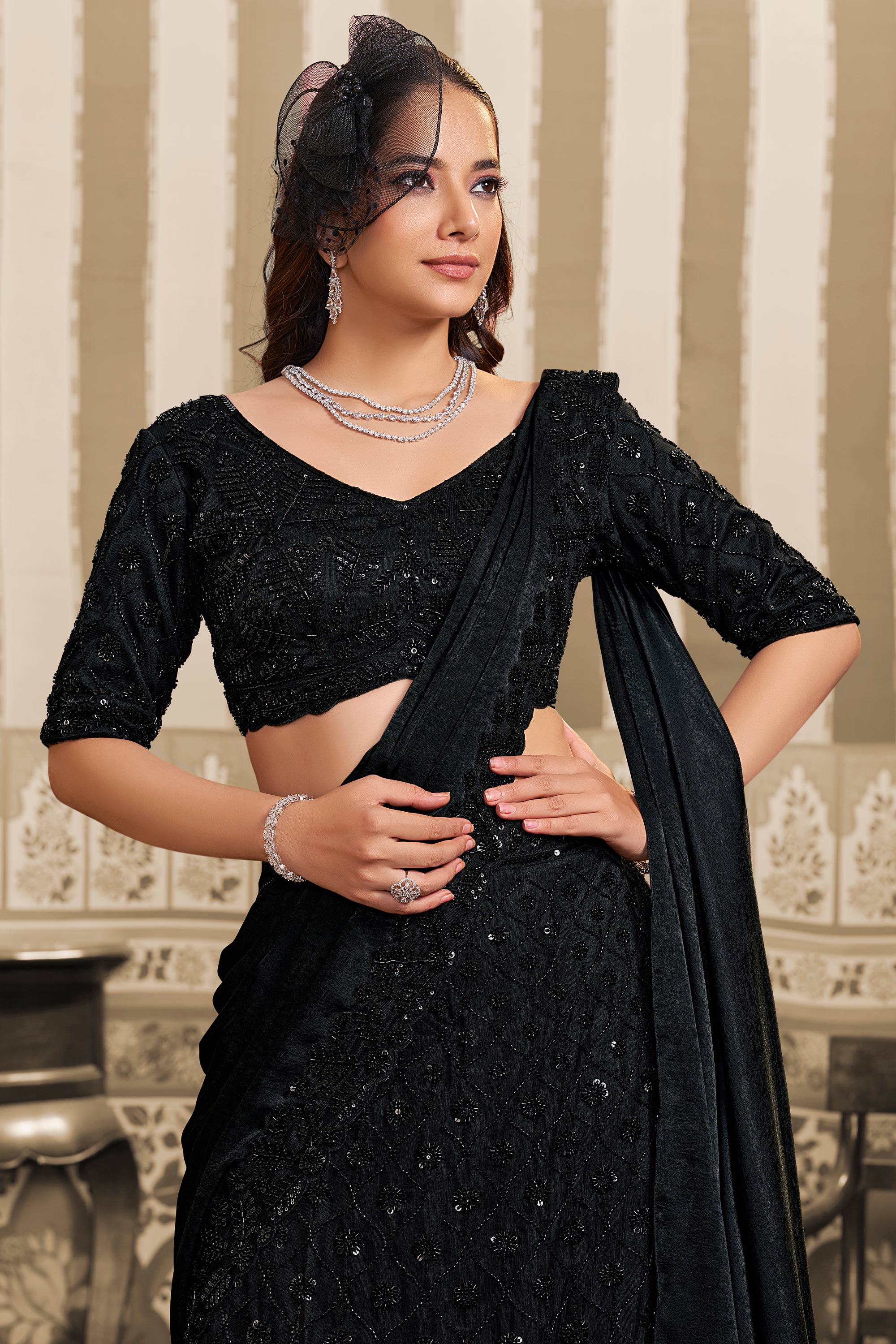 Black Wedding Wear Satin Sequins Work Ready To Wear Lehenga Saree