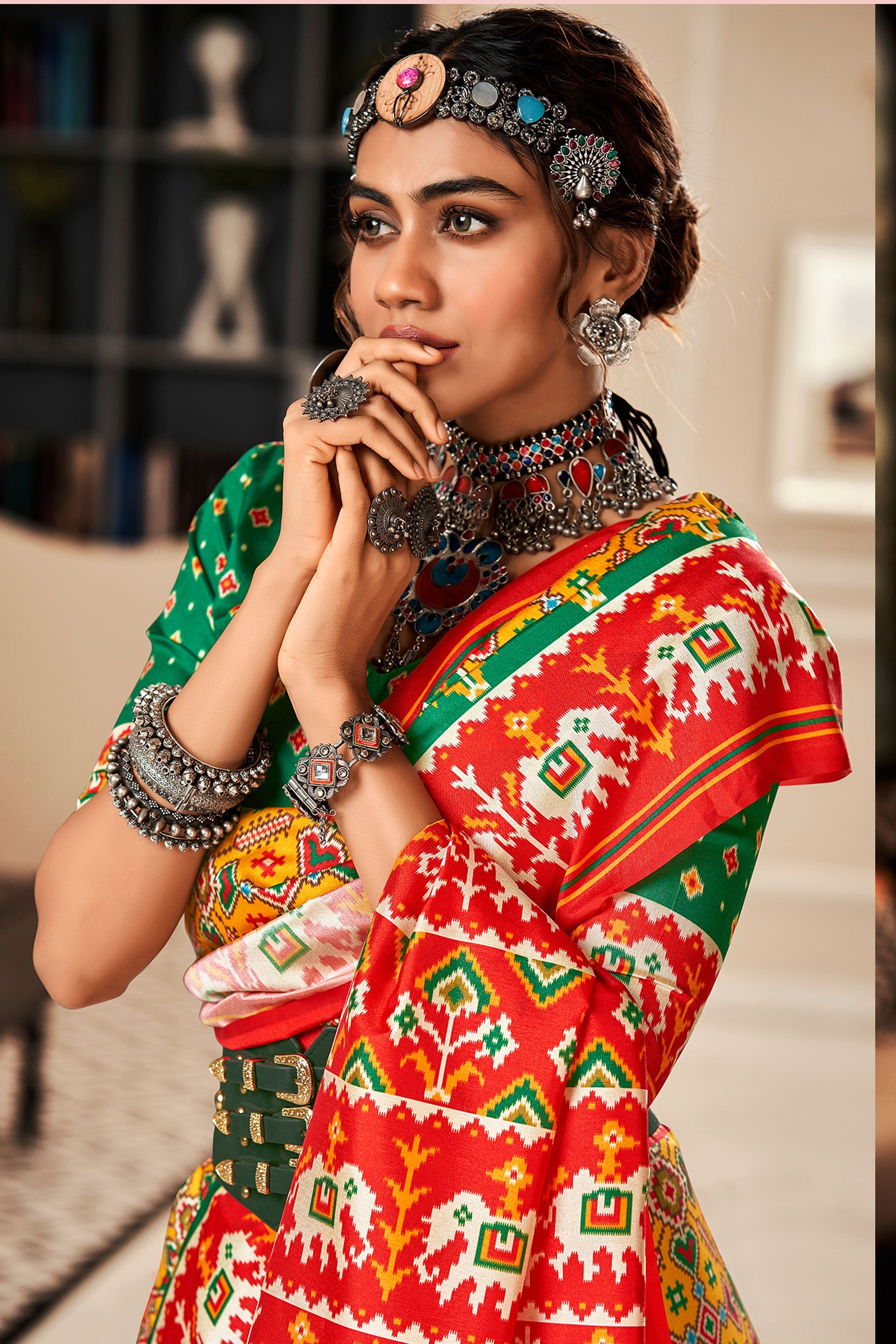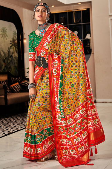Blazing Yellow Color Pure Tusser Patola Printed Saree