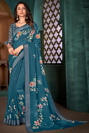 Blue Color Cotton Linen Fabric Casual Wear Appealing Digital Printed Saree