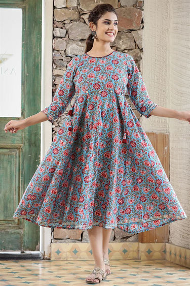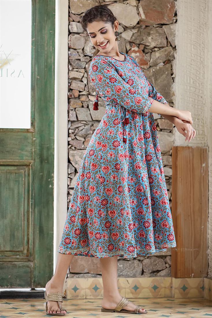 Blue Color Floral Printed Cotton Ethnic Kurti