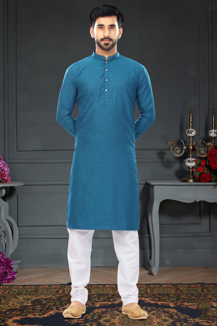 Blue Jacquard Work Kurta Pyjama In Cotton Fabric