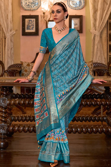 Bold and Beautiful Patola Silk Saree with Cyan Color Printed Designs