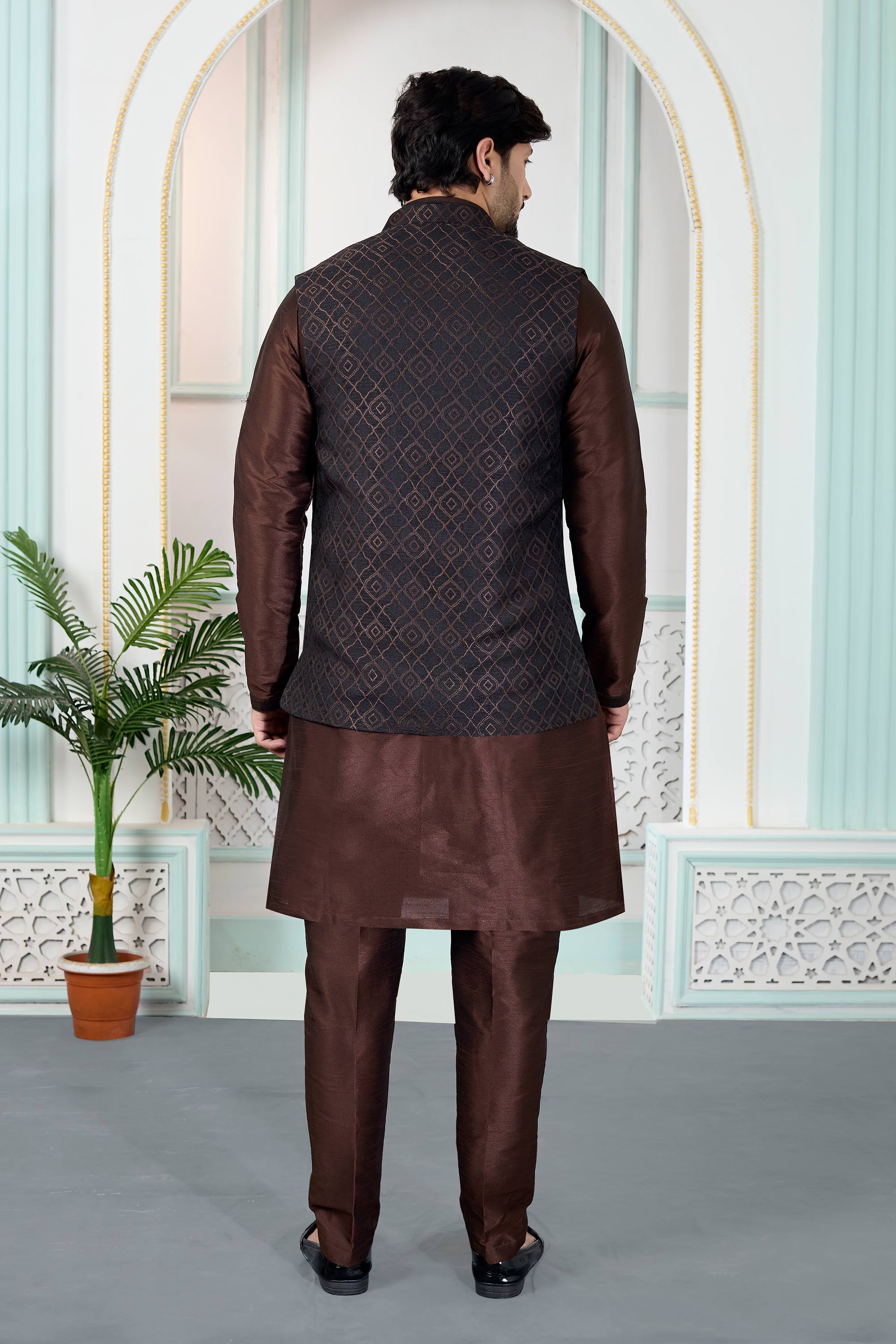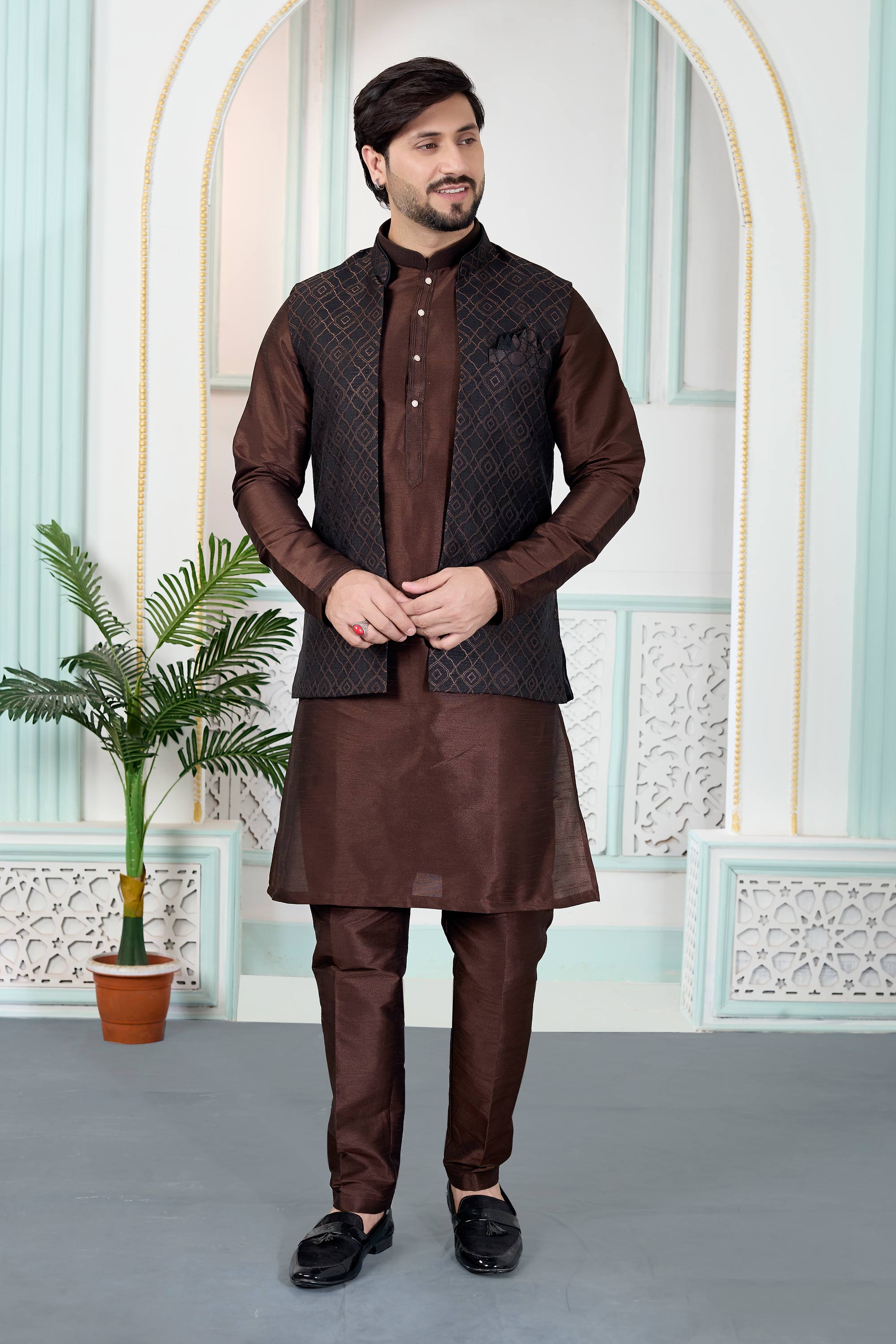 Step into festive sophistication with this Mens Kurta and Aligadhi Pant with Jacket Set, designed to reflect classic ethnic charm. Featuring a jacquard kurta, art Banarasi silk Aligadhi pant, and a comfortable faux satinlined jacket, this ensemble is ideal for weddings and special occasions, and slight color variations may occur due to digital photography.