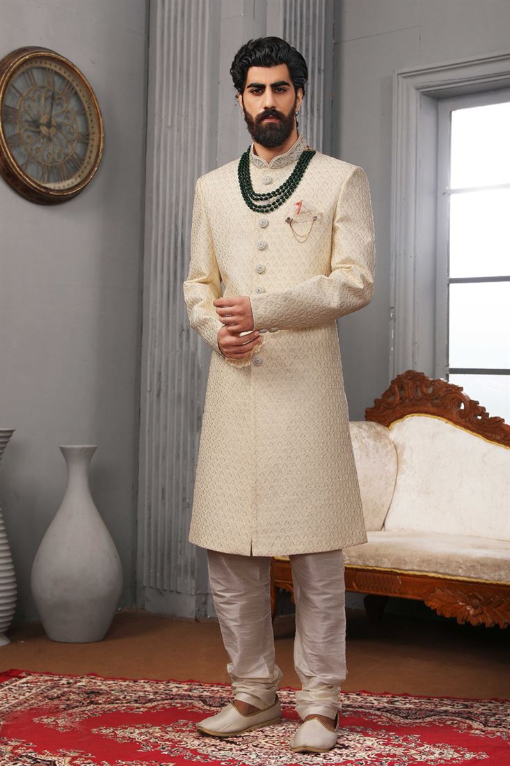 Captivating Beige Banarasi Silk Fabric Heavy Embroidered Designer Groom Sherwani