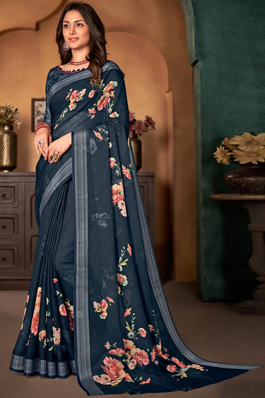 Casual Wear Cotton Linen Fabric Black Color Ingenious Digital Printed Saree