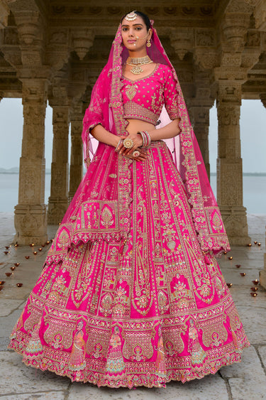 Experience timeless beauty with our Ruby Reach Color Pure Silk Heavy Embroidered Bridal Lehenga Choli with Double Dupatta. Crafted from premium quality pure silk, this bridal set exudes opulence and charm. The elaborate embroidery highlights the lehenga and choli, ensuring the bride looks nothing short of royal. The double dupatta adds a unique touch, providing multiple ways to drape and accessorize.This ensemble is tailored for ultimate comfort without compromising on grandeur. The lehenga features rich motifs that perfectly complement the finely crafted choli. Each dupatta adds depth and layers, allowing brides to create their desired bridal silhouette. Available in a variety of sizes, this set promises to enhance every bride's natural beauty on her most memorable day.