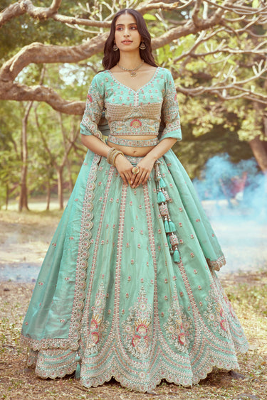 Champagne Sea Green Pure Organza Heavy Embroidered Bridal Lehenga Choli