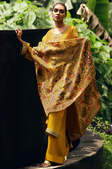 Charm Muslin Silk Embroidered Pakistani Salwar Kameez In Yellow Color