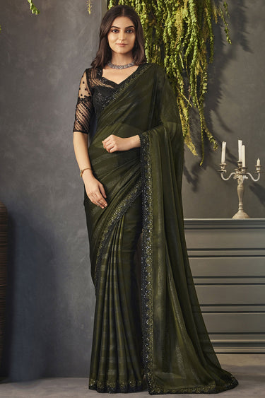 Chiffon Fabric Lace Border Work Glamorous Green Color Saree With Embroidered Blouse