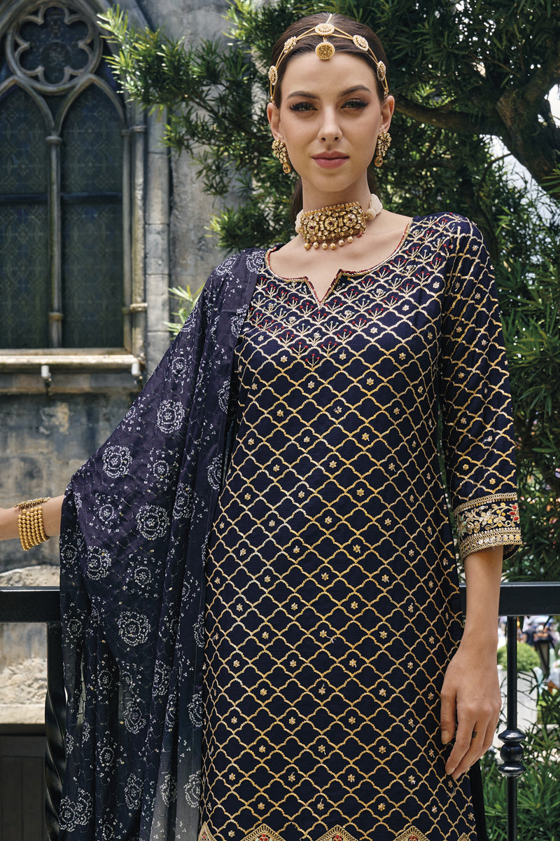 Chinon Fabric Navy Blue Color Festive Wear Embroidered Readymade Palazzo Salwar Kameez
