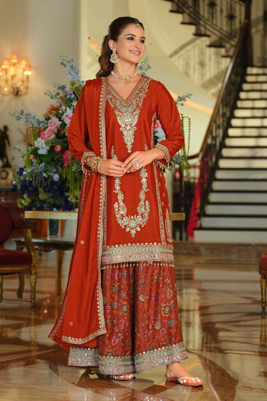 Chinon Fabric Red Embroidered Readymade Palazzo Suit For Festive Wear