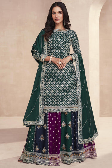Chinon Silk Fabric Embroidered Readymade Sharara Top Lehenga In Dark Green Color