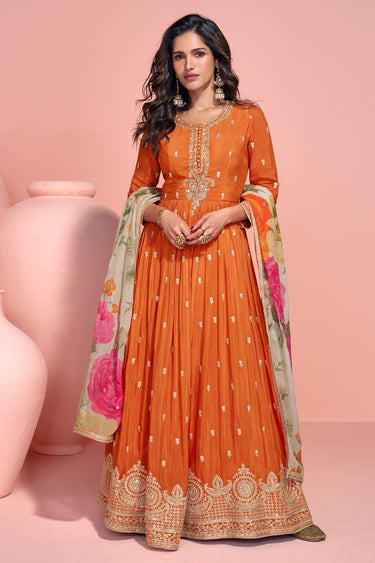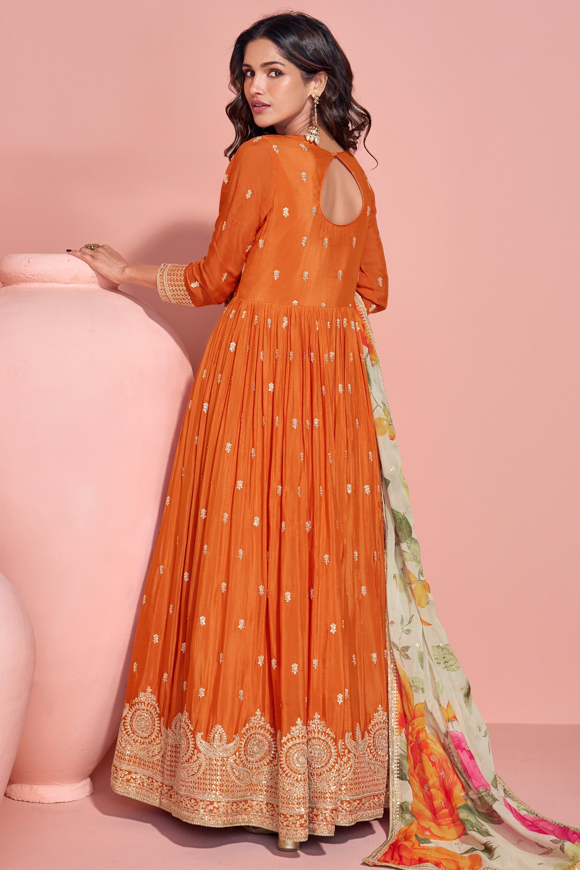 Chinon Silk Orange Floor Touch Readymade Gown With Dupatta
