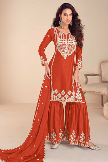 Chinon Silk Rust Color Glamorous Festive Style Readymade Gharara Suit
