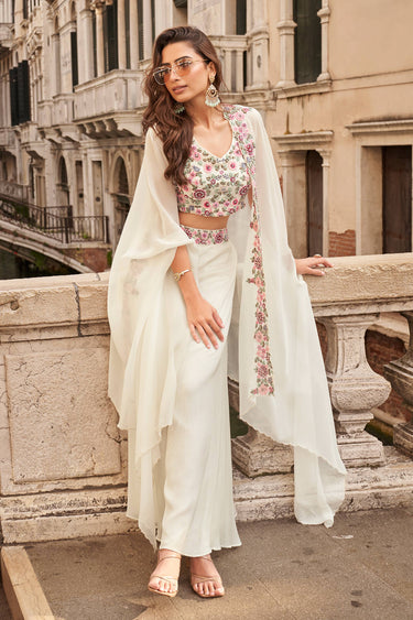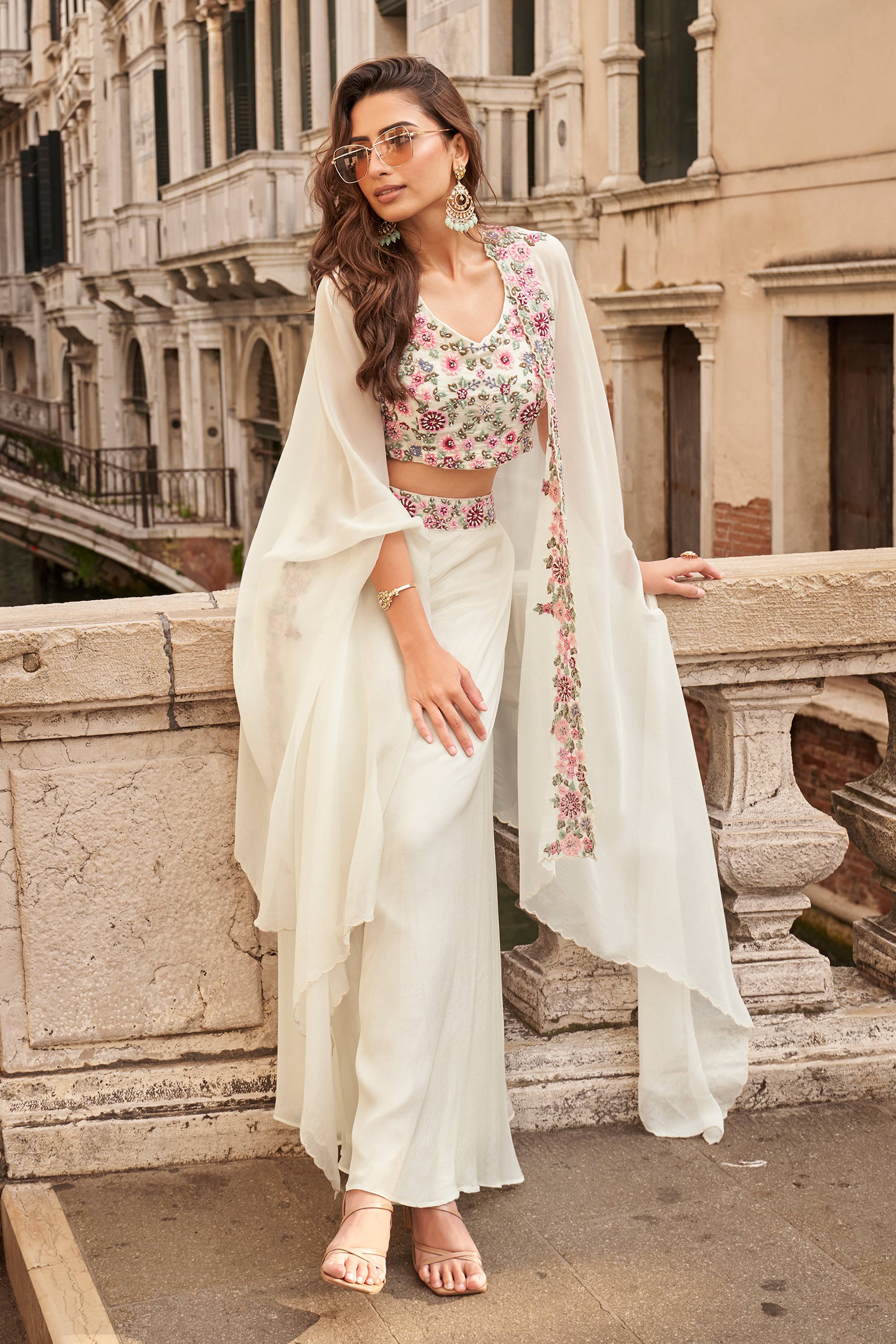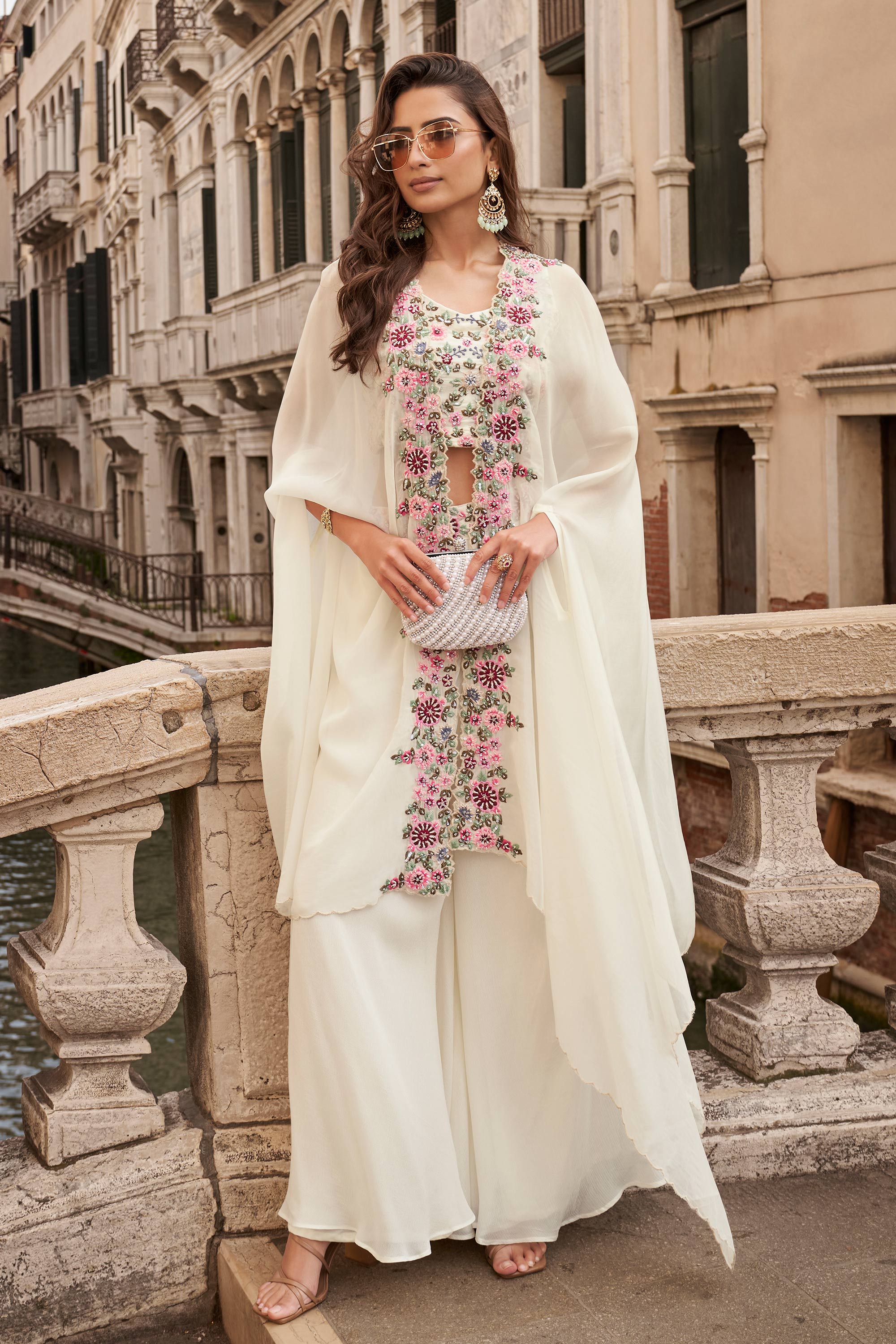 Chinon White Party Wear Readymade Palazzo Set With Designer Blouse And Shrug