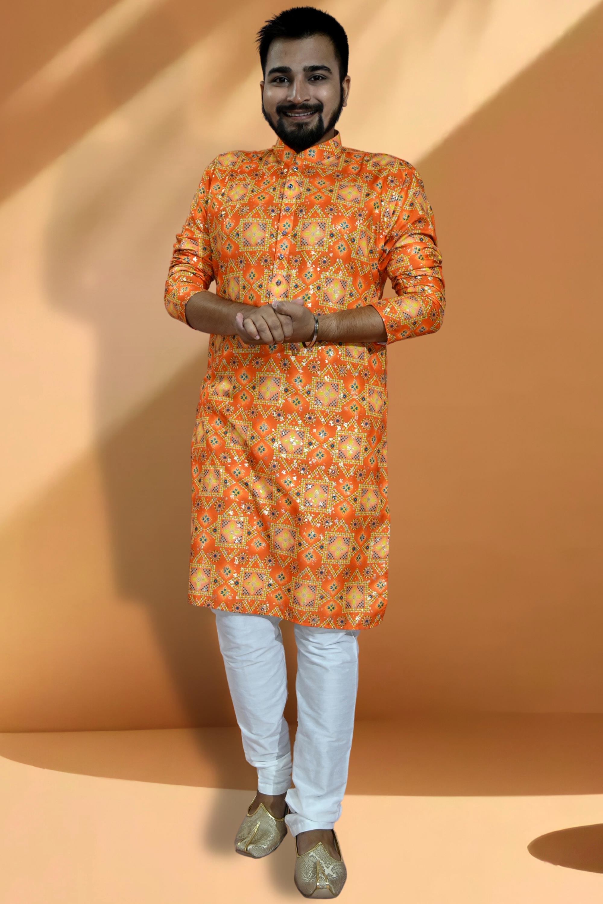 Cotton Fabric Readymade Orange Color Kurta Pyjama For Men