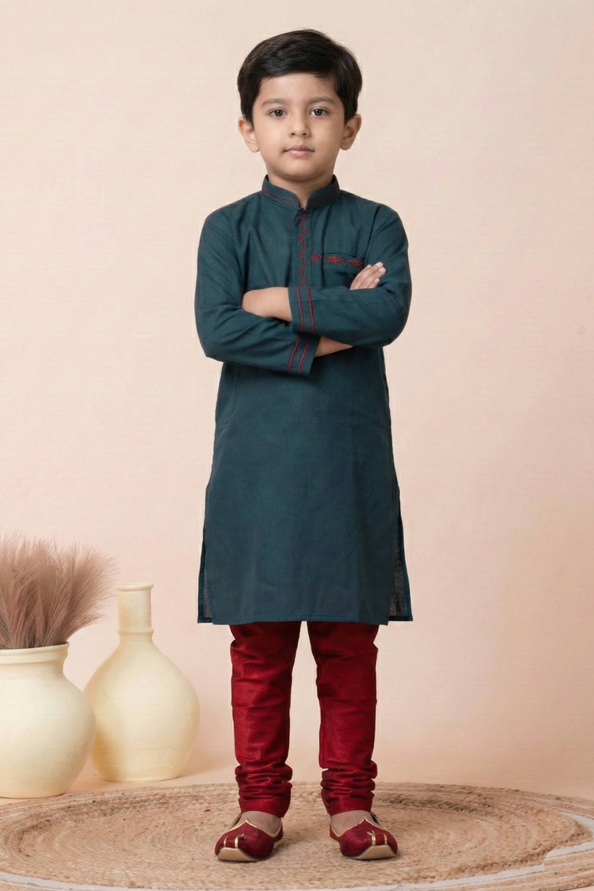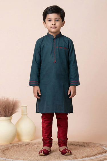 Cotton Fabric Teal Festive Wear Boys Readymade Kurta Pyjama