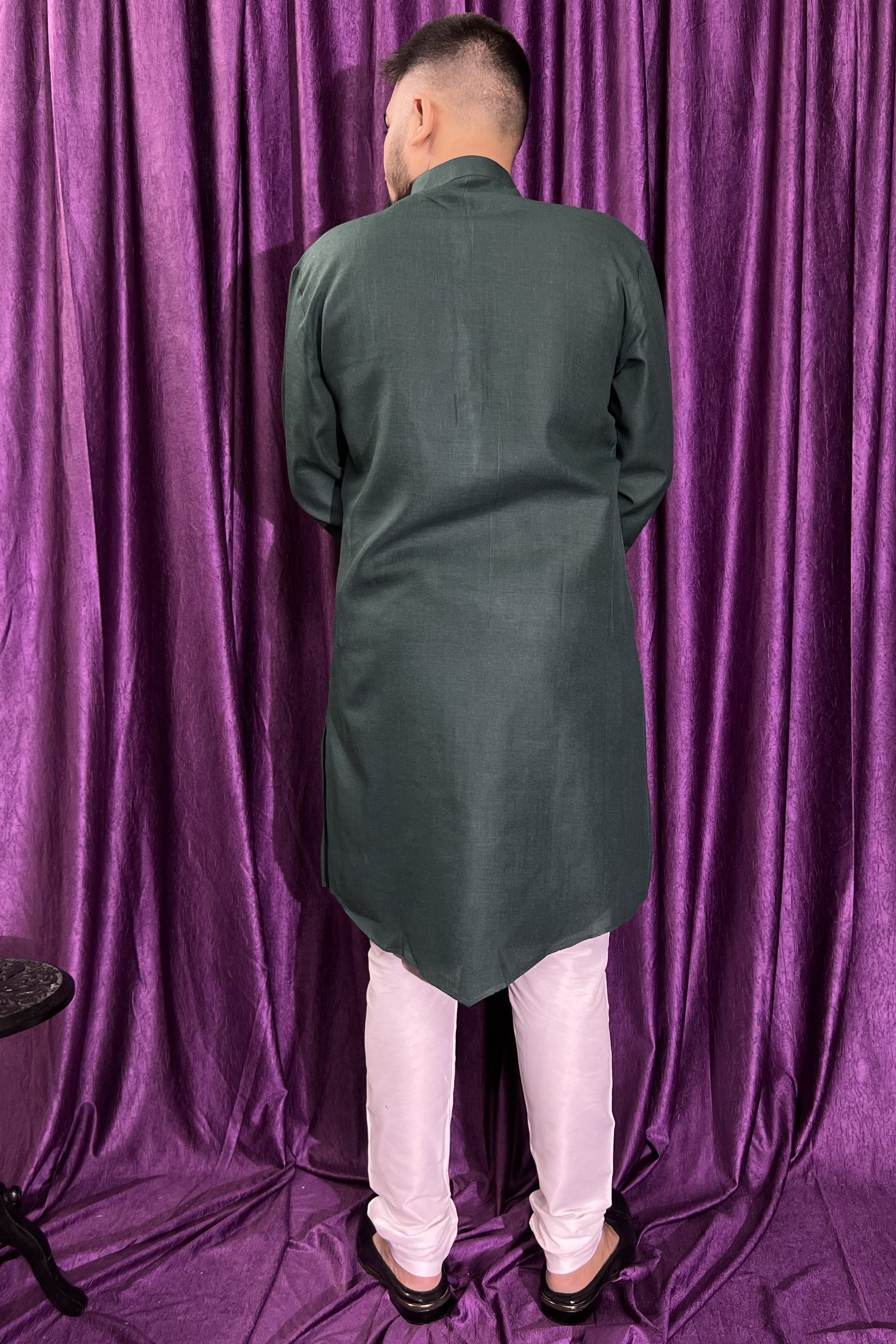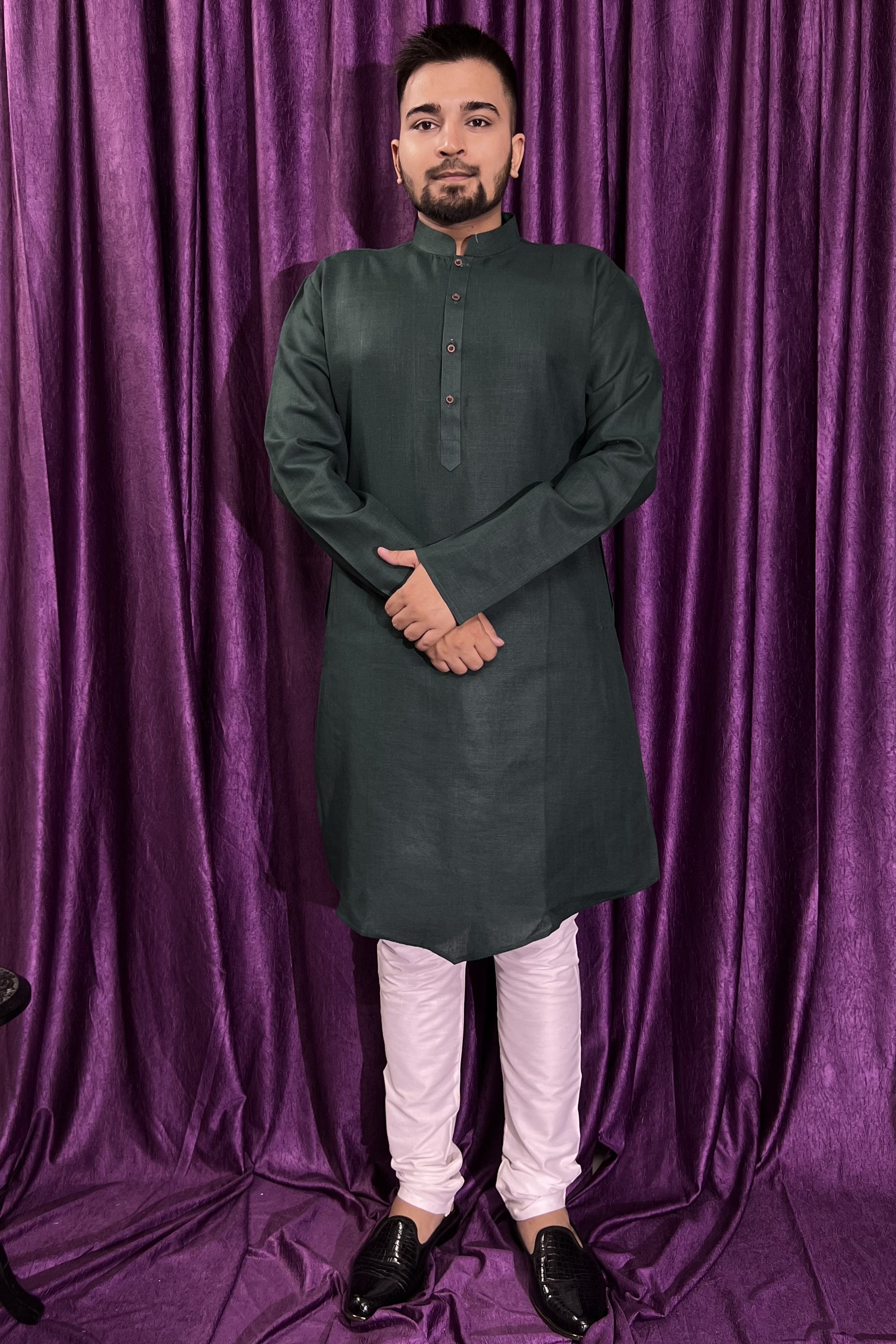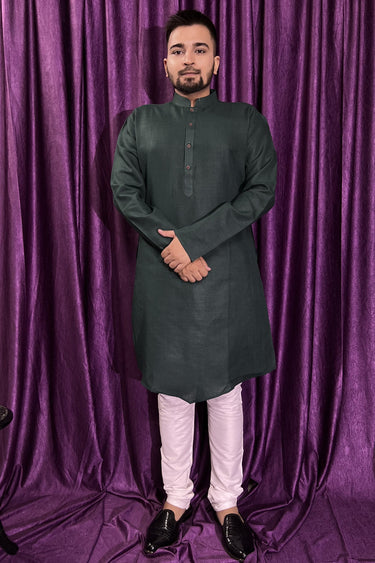 Cotton Fabric Wedding Wear Readymade Pretty Dark Green Color Kurta Pyjama For Men