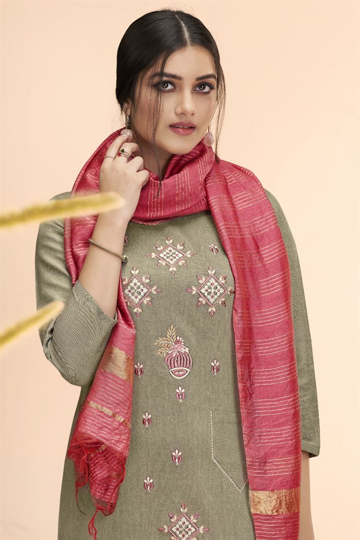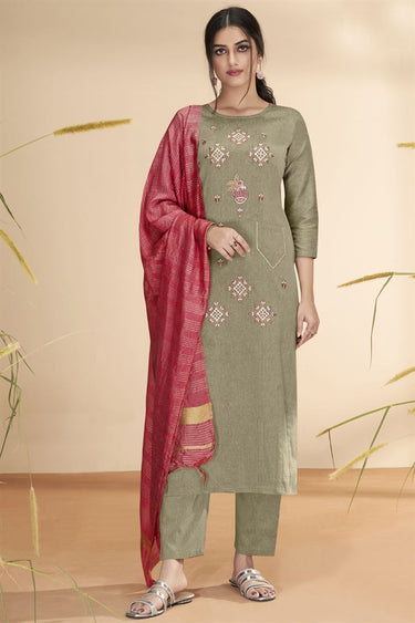 Cotton Gorgeous Embroidered Khaki Color Function Wear Readymade Straight Cut Suit
