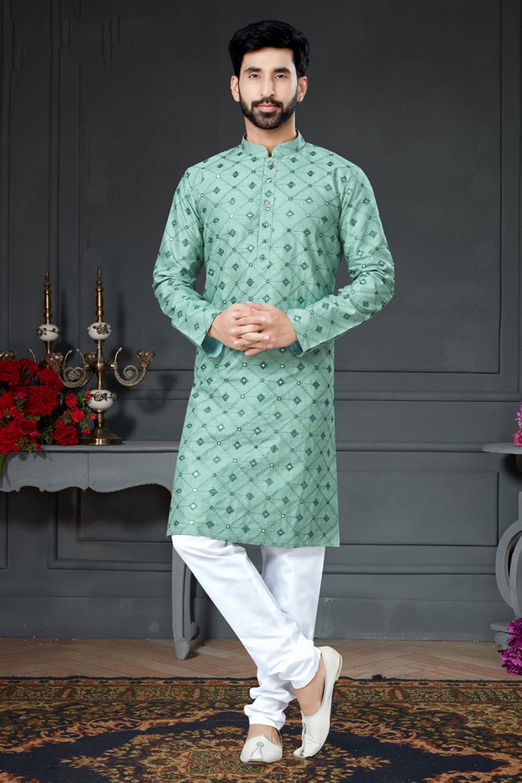 Cotton Silk Fabric Function Wear Readymade Sea Green Color Kurta Pyjama For Men